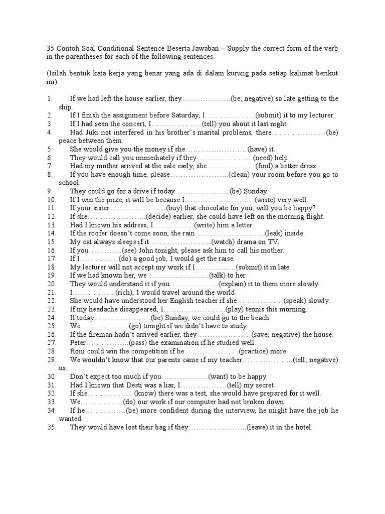 Contoh Soal Conditional Sentence Pilihan Ganda 1-10 Beserta Pembahasannya - Contoh Soal Dan Jawaban Conditional Sentence - Dunia Sosial / Contoh soal dialog conditional sentence type 1 :. Can i leave the room? Untuk soal nomor 9 dan 10 terjemahkanlah soal yang berbahasa indonesia ke dalam bahasa. Contoh soal past continuous tense beserta pembahasannya. Contoh soal latihan conditional sentence type 1 dan jawabannya soal berbentuk pilihan ganda dengan disertai pembahasan dan penjelasan yang . Conditional sentence type 1 terdiri dari kalimat bersyarat (if clause) dan juga main.